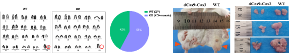 基于该策略,研究人员利用3条靶向Y染色体的crRNA,成功构建了Y染色体敲除小鼠,该小鼠模型具有性反转、Y染色体缺失、生殖结构异常等为特纳综合征(Turner syndrome)表型。进一步,通过设计位于性别决定基因(Sry基因)3'端的dCas9sgRNA,以期实现CRISPR Type I-E介导的大片段基因精确敲除动物模型。结果表明,在dCas9的调控下,实现了部分Y染色体敲除小鼠,但保留了Sry基因,该小鼠模型未发生性反转,但其生殖功能严重障碍。