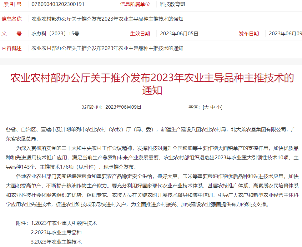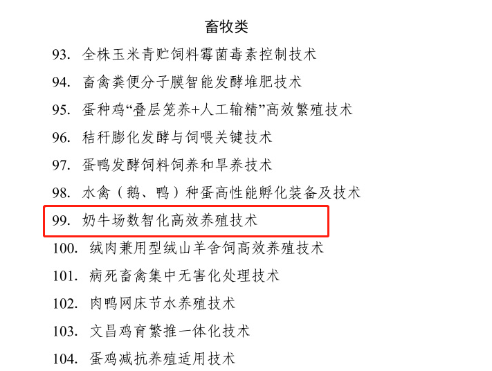 近日,农业农村部发布了2023年农业主导品种和主推技术的通知,共遴选出10项重大引领性技术、143个主导品种和176项主推技术。其中,公司动物繁殖调控团队主导完成的“奶牛场数智化高效养殖技术”成功入选主推技术。推介发布农业主导品种主推技术,旨在发挥科技对提升全国粮油等主要作物大面积单产的支撑作用,加快优质品种和先进适用技术推广应用,满足当前生产急需和未来产业发展需要。