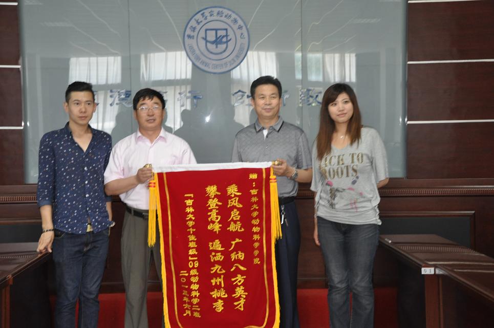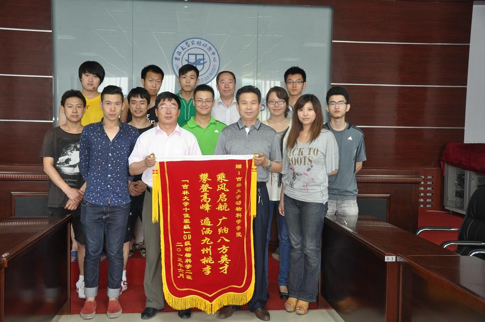 6月28日下午2:30,2009级动物科学2班毕业生在离校之际向公司赠送了锦旗。公司经理张嘉保教授、党委书记赵光军老师、党委副书记曹伟光老师、毕业班辅导员肖建荣及部分毕业生代表参加了此次赠予仪式。