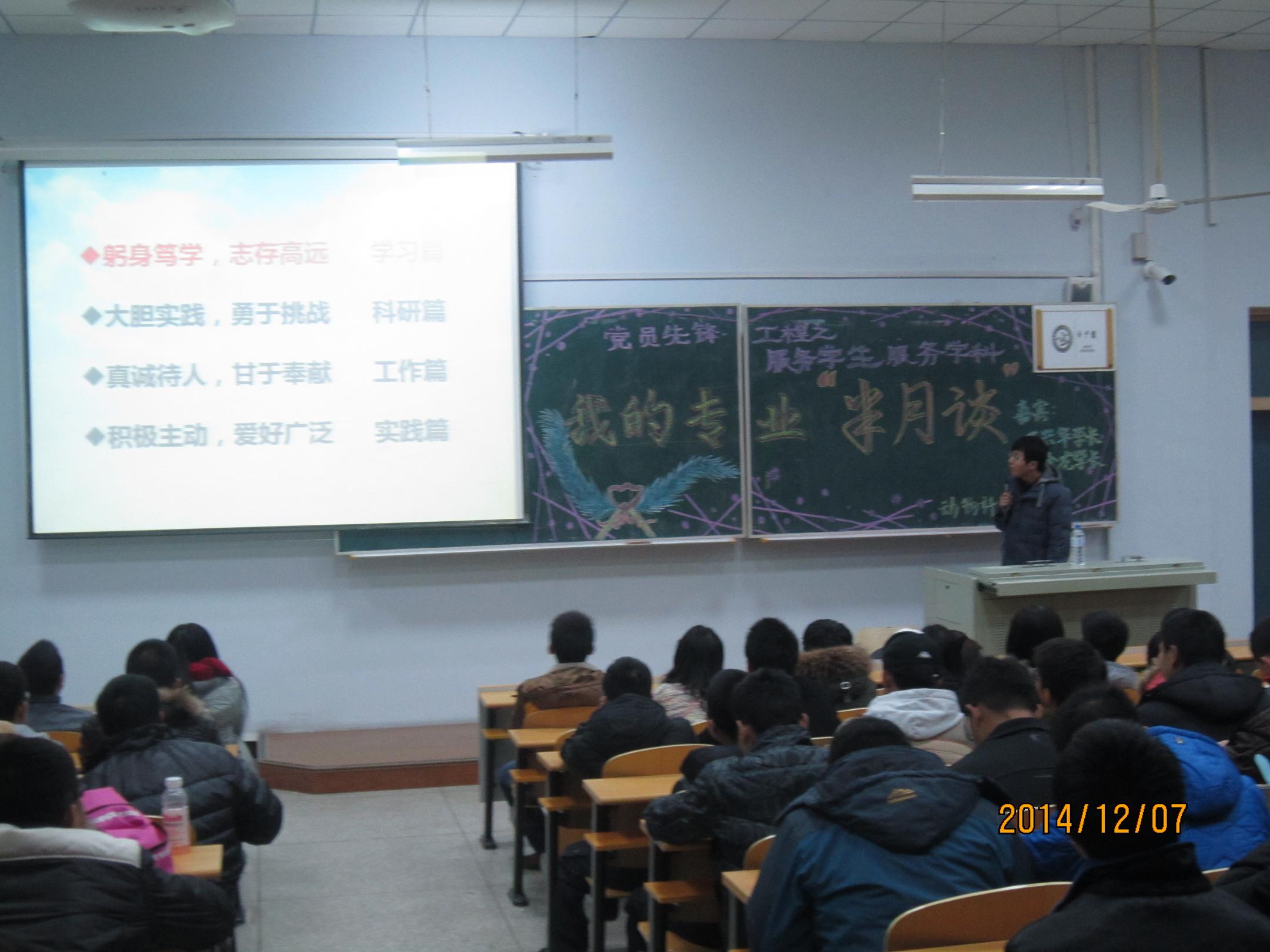 2014年12月7日,周日下午一点半,2014级全体本科生齐聚科学讲堂100教室,以热烈的掌声欢迎本期嘉宾2011级动物科学专业于兴华、索金龙学长的到来,年级辅导员助理孙宏欣学长也到场参加本次分享。