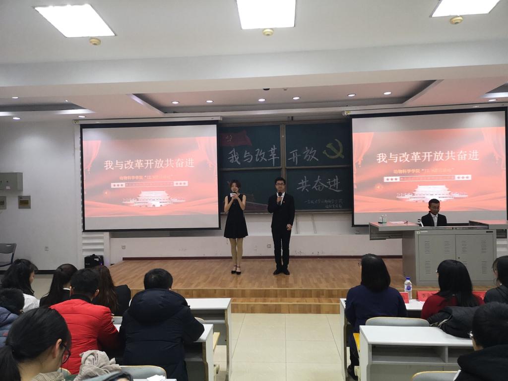 活动伊始,主持人吕焱、赵天玥致开幕词,向同学们介绍到场嘉宾。随后同学们观看了改革开放四十周年相关视频——《变与不变》。通过精彩的视频同学们更加了解改革开放四十周年以来中国发生的翻天覆地的巨大变化,提高的是人民的生活水平,不变的是人们心中对幸福的渴望和追求。为活跃现场气氛,由2018级同学为大家带来了十分精彩的小节目:运用多国语言完美呈现的歌曲《告白气球》演绎了新一代年轻人的青春活力;而《牵手理想》则以支教员工的独特视角展现了当代老员工的社会时代使命和责任担当;一曲《北京东路的日子》又将同学带回了青涩的中学时代。