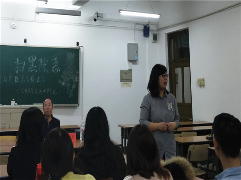 会议伊始,曹伟光书记给大家讲述了此次扫黑除恶活动的现实背景,希望同学们认识到关于黑恶势力问题的严重性,强调作为高校员工应该提高思想意识水平,自觉肩负起扫黑除恶、努力维护校园良好环境的责任。并且员工骨干更应对此高度负责,在会后尽快向班内员工传达此次“扫黑除恶”宣讲的重要思想,做好落实工作。紧接着,曹书记就校园贷、传销组织、电信诈骗等与员工相关的社会违法问题,富有针对性地为大家进行了解读,并在最后发言中希望同学们能够对这些问题及时排查、反映上报,为清除校园内的黑恶势力贡献一份力量。大会最后,肖建荣老师进行了会议总结,提出希望同学们充分警惕黑恶势力相关事件的发生,更希望在今年这个政治大年,大家能够把握机会,了解我国过去发生的大事以及国家崛起的历程,提升国家自信和自身的政治素养。