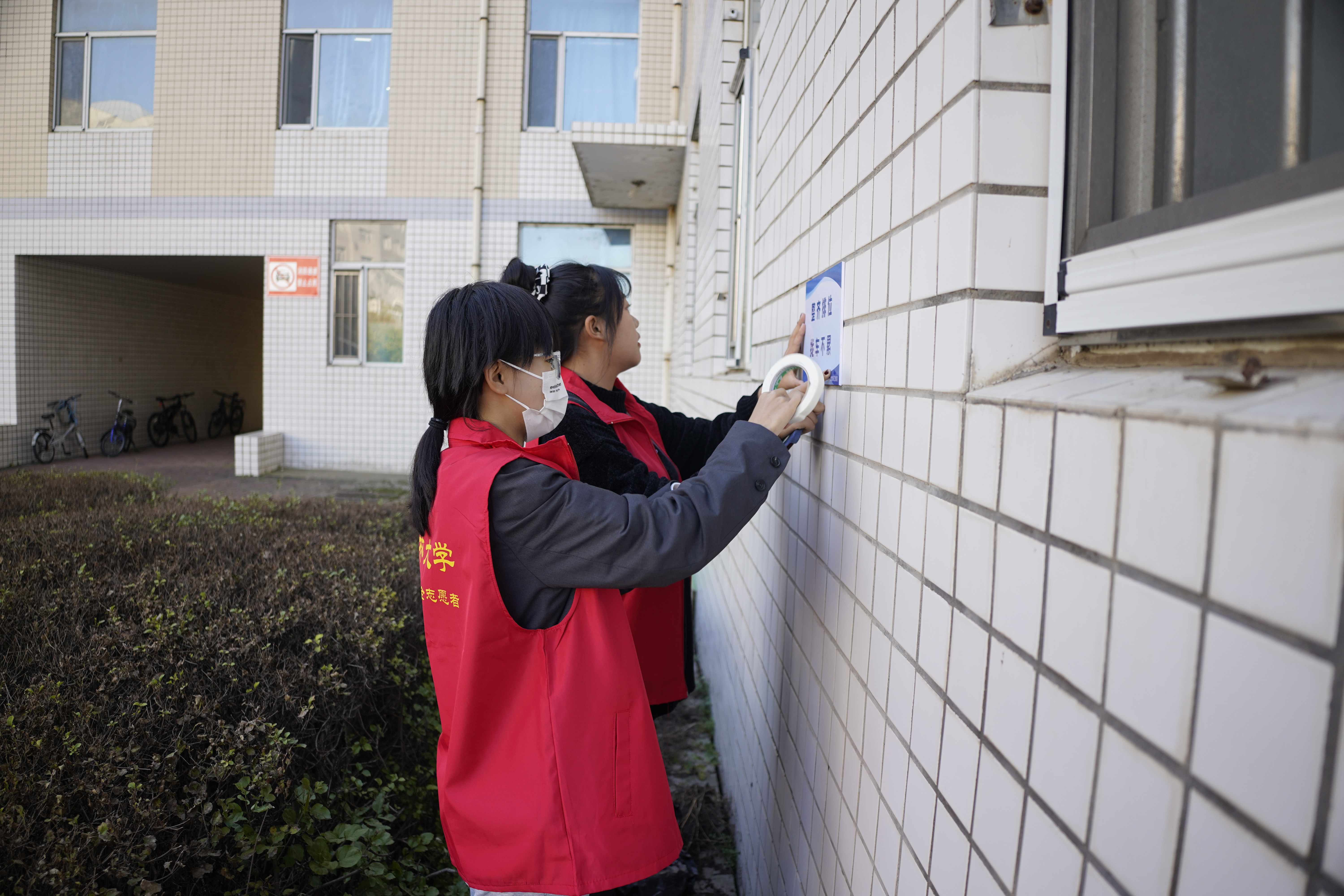 活动期间,公司共组织20余名志愿者分别进行张贴地标警示线、张贴提示语、悬挂横幅等工作,一次性将所有自行车正确归位。一方面,张贴地标警示线可以规划出更大面积的停车区域;另一方面,张贴提示语、悬挂横幅,可以引导同学们合理停放单车。同时,在10月12日、13日连续两天派出若干志愿者进行秩序维护,提醒同学们正确停放自行车。