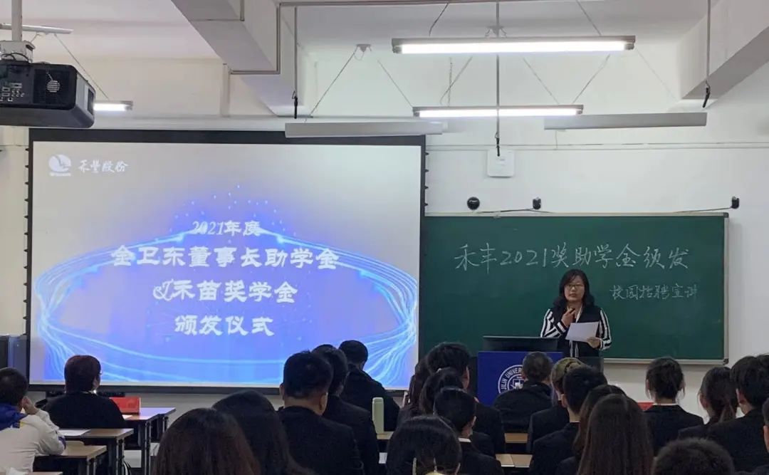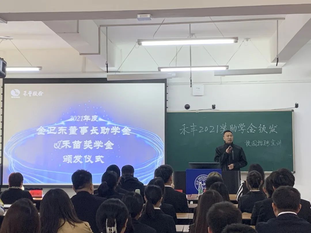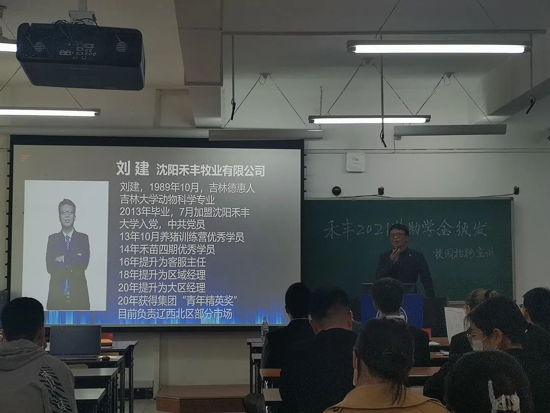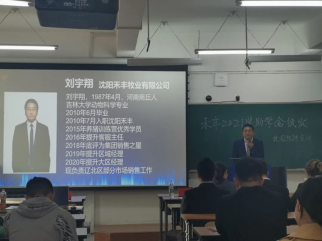 情系高校学子,聚焦农科人才,成就青年梦想。10月29日下午13:00,禾丰董事长助学金、禾苗奖学金颁发仪式暨禾丰牧业校园招聘会在威廉体育和平校区科学讲堂301教室顺利举办。出席本次活动的有禾丰股份辽宁区人力资源总监付明、辽宁区招聘COE杜娟,沈阳禾丰牧业有限公司销售总经理吴东波,大区经理刘建、刘宇翔,人力资源经理王雪,动物医学公司党委书记饶家辉、党委副书记秦明、学办主任谭瑶,公司党委副书记肖建荣。