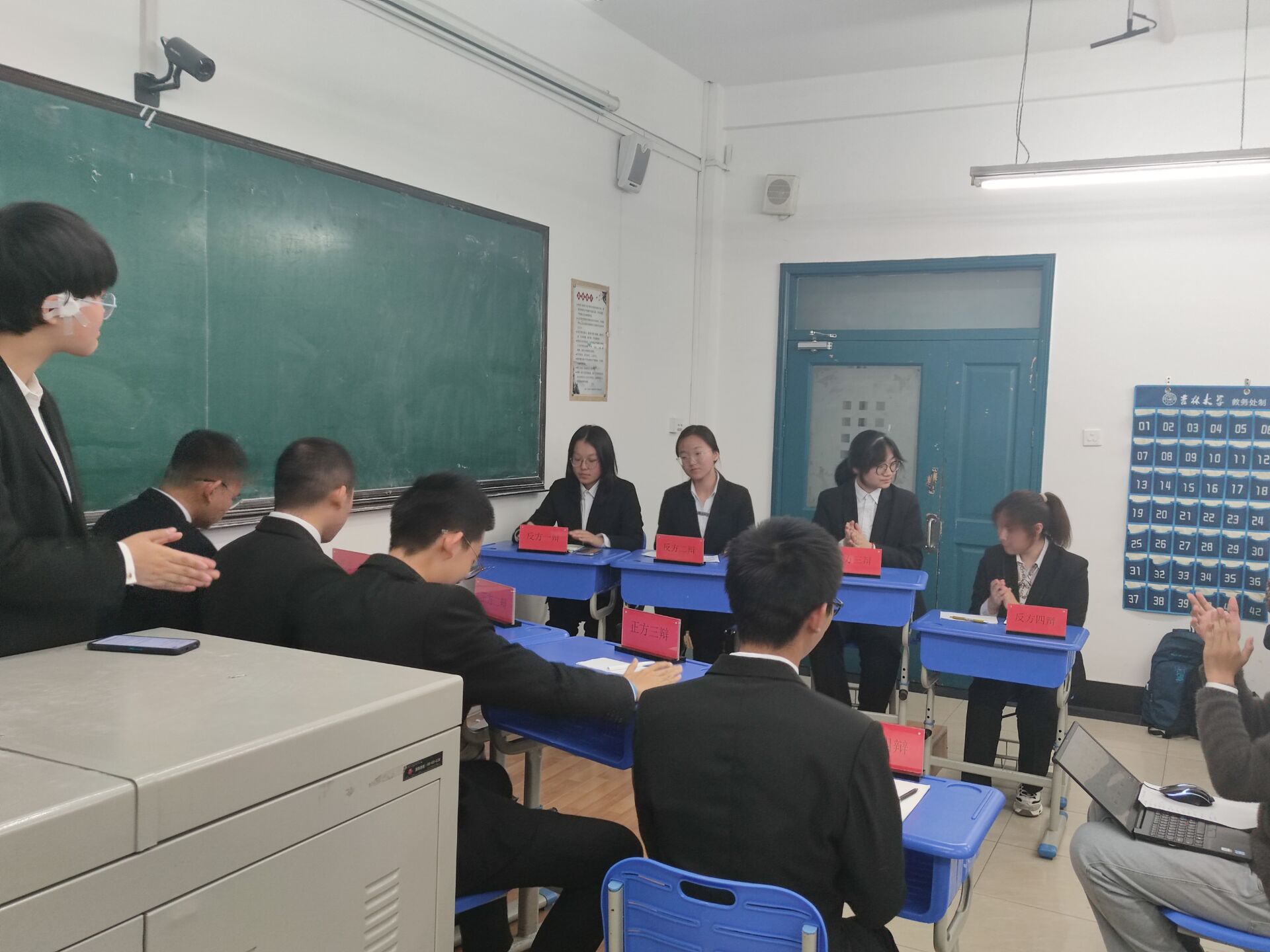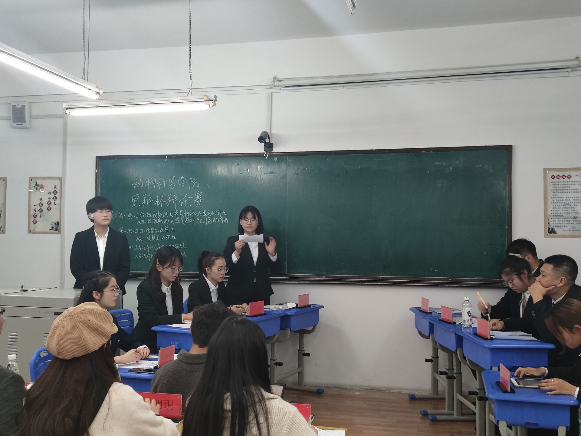 经过短暂的休整,第二场比赛随之开始。双方辩手显然都准备充分,攻辩之间足见他们场下所做努力。正方辩手彼此默契,气场十足。胡灵蕊同学的阐述精妙而犀利,总结己方观点的同时又巧妙地攻击了对方的薄弱环节。反方辩友也不甘示弱,引经据典,旁征博引,为主要论点不断补充论据素材。