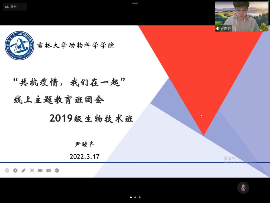 为引导同学们遵守疫情防控相关管理规定,做好个人防护,以良好的心态进行学习生活,2019级生物技术班级于2022年3月17日晚18时整,开展“共抗疫情 我们在一起”主题线上班会,班主任艾永兴老师、辅导员尹暄齐老师以及全班同学参与会议。