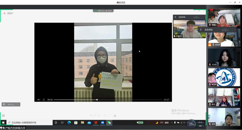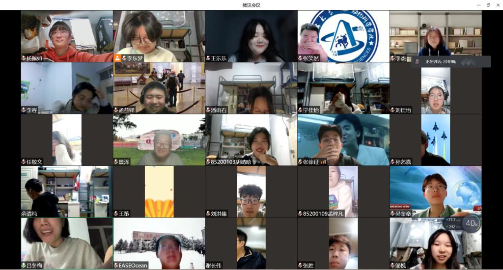 接下来,辅导员尹暄齐组织同学一同观看了身边人战“疫”故事短片,片中为我们展现了日常生活保障的志愿者、后勤工作者的风貌,增强了同学们共同抗疫、众志成城的决心。同学们也分享了隔离以来自己做志愿者的经历。从一开始的短暂慌乱,到克服过程中的各种困难,再到听到一声声“谢谢”的成就感、幸福感,孟益铎同学说,这是“甜蜜的”,孙艺嘉同学说,这是“温暖的”,李东梦、李杰同学说,这是“感动的”。此外,同学们提出隔离时期学习、生活上的困难和问题,辅导员尹暄齐表示,一定会沟通各方,尽力解决,同时也鼓励同学们克服困难,共度时艰。