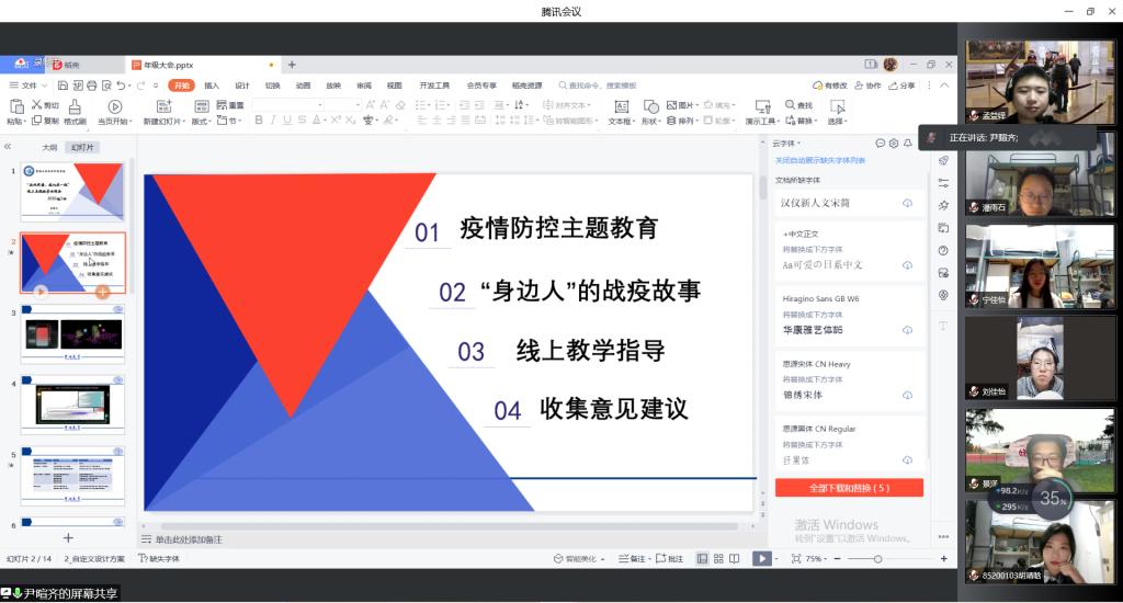 会议伊始,辅导员尹暄齐针对目前疫情防控进行了主题教育,从本次疫情的主要传播毒株、传播范围、毒株特性和疫苗有效性等方面展开,并提醒同学们要勤清洁、常通风、重日常、少聚集、严戴口罩,并按时完成打卡,叮嘱同学们关注官方防控要求、配合隔离工作,共同抗击疫情。