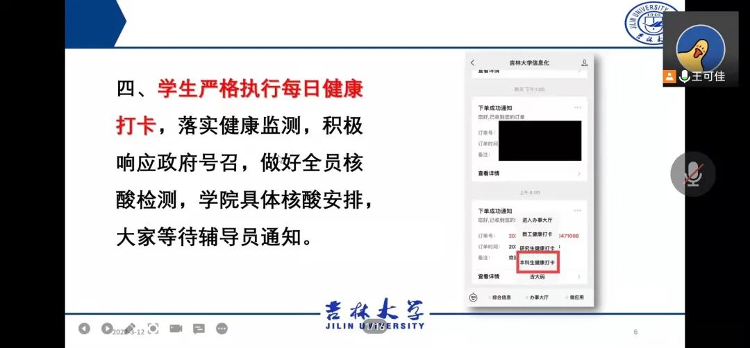 同学们暖心回应:“老师们请放心,我们将严格遵守公司规定,合理规划本学期学习生活,认真完成线上课程,做自己生命健康的第一责任人,守护我们的吉大校园,更守护我们的家。”与会老师叮嘱同学们坚决要做到三个“要”:一是要相信,相信国家、相信公司;二是要重视,重视疫情、重视防控;三是要适应,适应教学方式、适应封校生活。