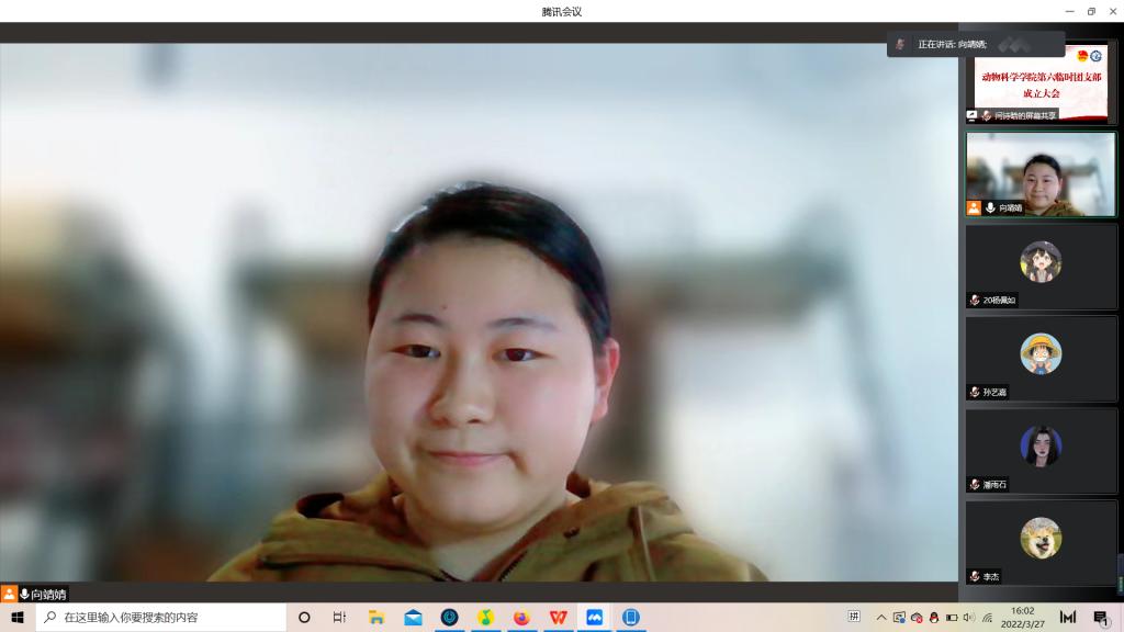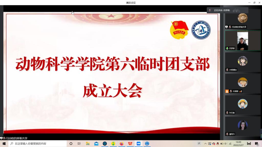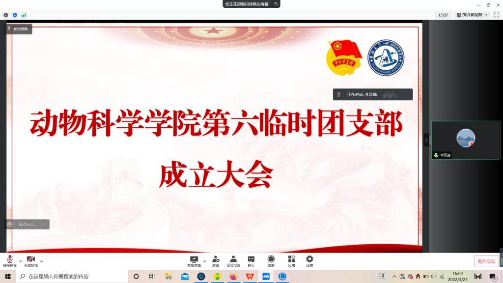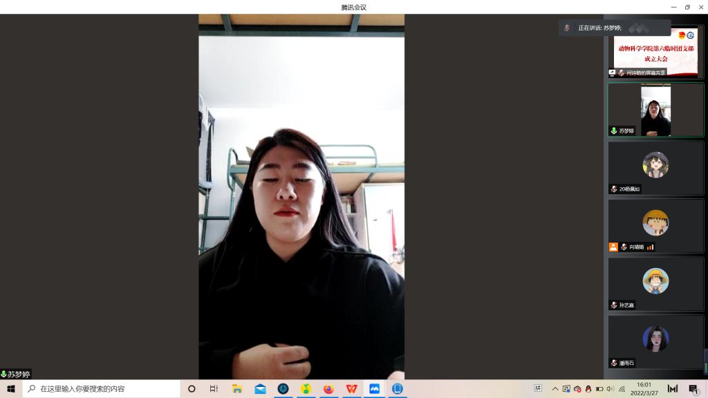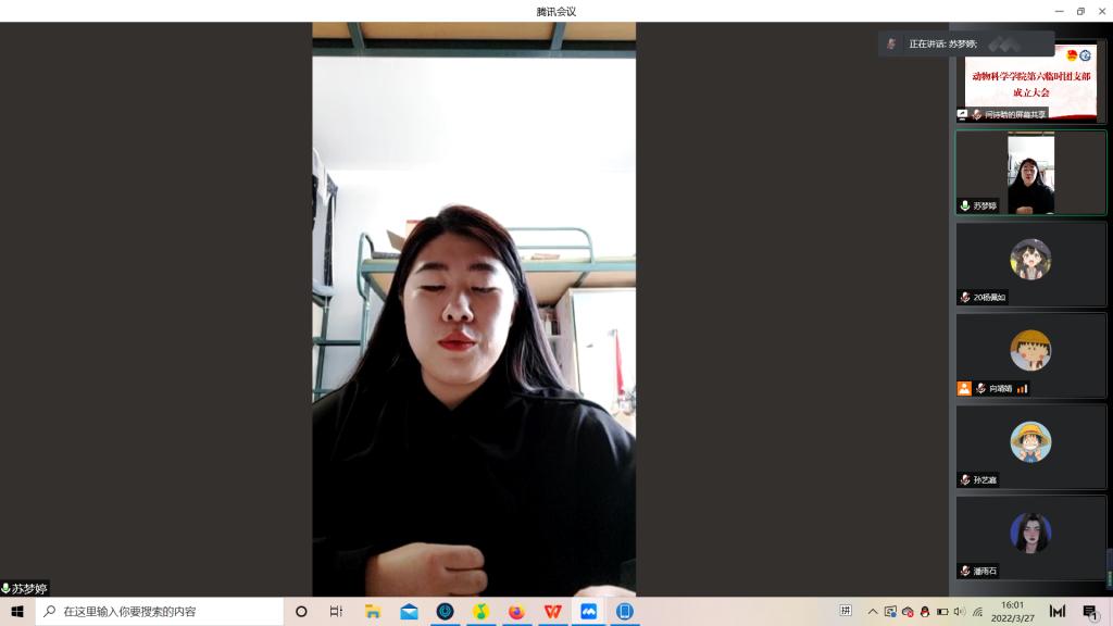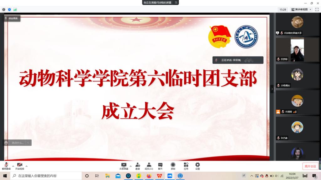为积极响应校团委号召,强化团的基层建设,切实发挥共青团组织在防疫控疫工作中的战斗堡垒作用及团员的先锋模范作用,落实《关于疫情防控期间成立临时团支部的通知》的工作安排,威廉体育第六临时团支部成立大会于3月29日下午四点由支部书记苏梦婷主持召开。支部全体成员即2018级、2019级实验动物班和2020级一班和平二公寓共34名同学参会。