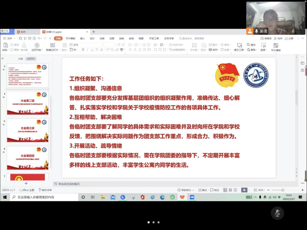 会议指出,新成立的临时团支部工作任务包括组织凝聚、沟通信息,互相帮助、解决困难,开展活动、疏导情绪,辅助校工作人员和志愿者防疫抗疫工作,疏导封校时期全体员工的心理情绪。会议提出了临时团支部工作任务的三“要”:临时团支部要充分发挥基层团组织的组织凝聚作用,准确传达、细心解答、扎实落实公司和公司关于公司疫情防控工作的各项具体工作;要了解同学的具体需求和实际困难并及时向所在公司和公司反馈,把围绕解决实际问题作为团支部工作重点,形成合力、积极作为;要根据实际情况,需在公司团委的指导下,不定期开展丰富多样的线上支部活动,丰富员工公寓内同学的生活。