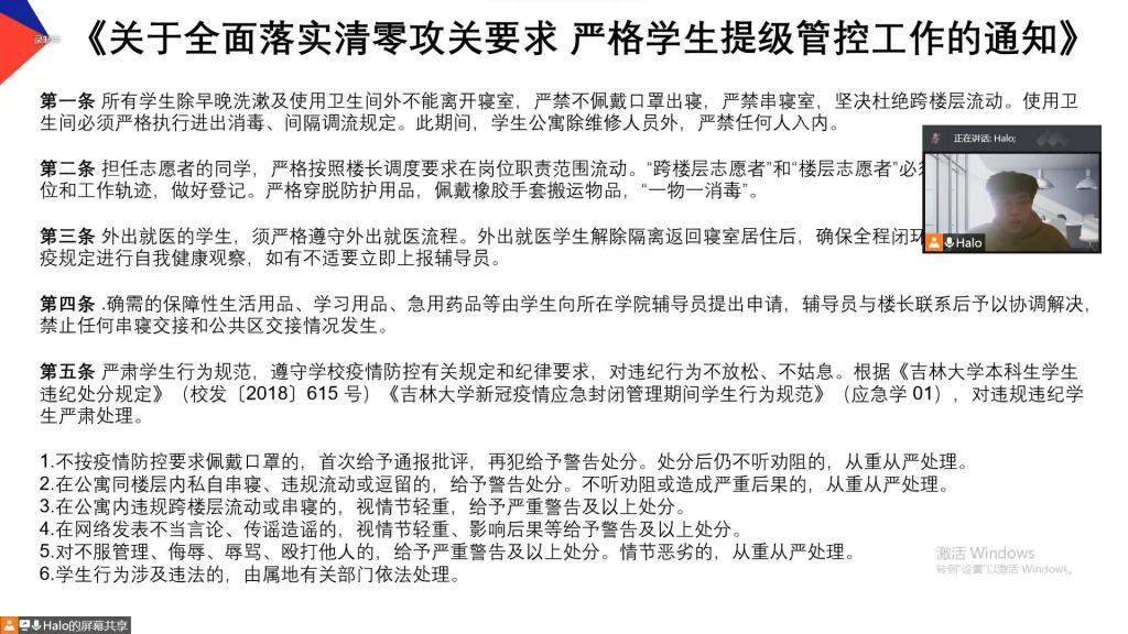 为了及时传达公司最新防疫政策,帮助同学们了解掌握“吉大订餐”微信公众号线上订餐流程以及注意事项,威廉体育于2022年4月8日中午12时召开2019级、2020级本科生线上年级大会,本次会议由员工辅导员尹暄齐主持,公司党委书记高福和、经理孙博兴以及2019级、2020级全体员工共同参与了本次会议。