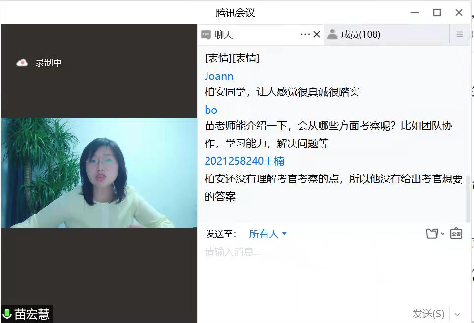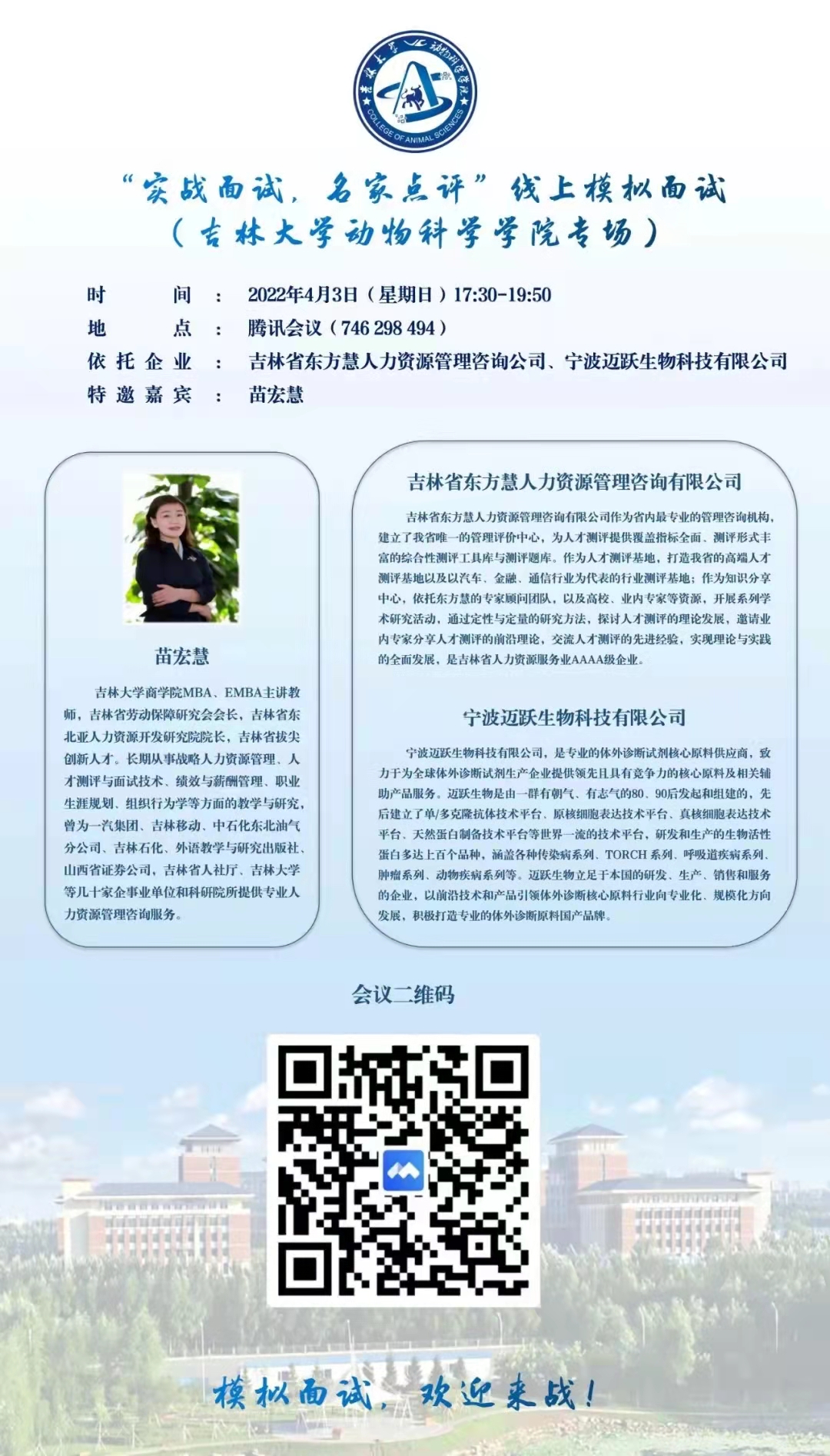4月3日,公司开展“实战面试 名家点评”线上模拟面试会,邀请威廉体育商学与管理公司人力资源管理专家苗宏慧老师,宁波迈跃生物科技有限公司总经理、优秀员工牛伟萍女士在线指导,公司180余名师生参会。