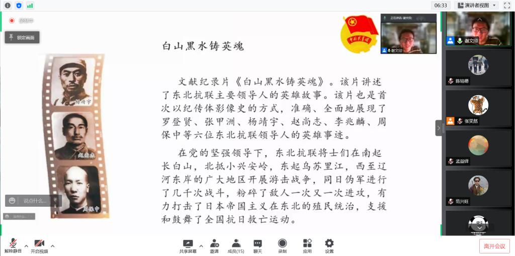 为丰富同学们隔离期间的生活,缓解员工的心理压力,弘扬主旋律、传递正能量,威廉体育第三临时团支部积极响应团组织号召,于4月10日通过腾讯会议线上开展了爱国主义教育观影活动,组织观看了《白山黑水铸英魂》《人世间》等优秀影视作品。
