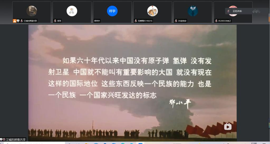 接下来,施政向同学们介绍了本次活动要观看的电影《横空出世》,该电影是一部以热血为主旋律的电影,真实地反映了我国原子弹研发的过程和那段艰苦卓绝的奋斗时光。电影的结尾,一朵巨型蘑菇云腾空而起,慢慢拨开,那一道耀眼的白光刺中了所有人的泪腺,他们欢呼着,哭泣着。那是喜悦的泪水,是值得骄傲的泪水。付出往往会有收获,只要一直坚持下去,再艰难的工程也有竣工的一天。随着电影的结束,同学们交流分享自己在这部电影中的体会,活动气氛达到高潮。
