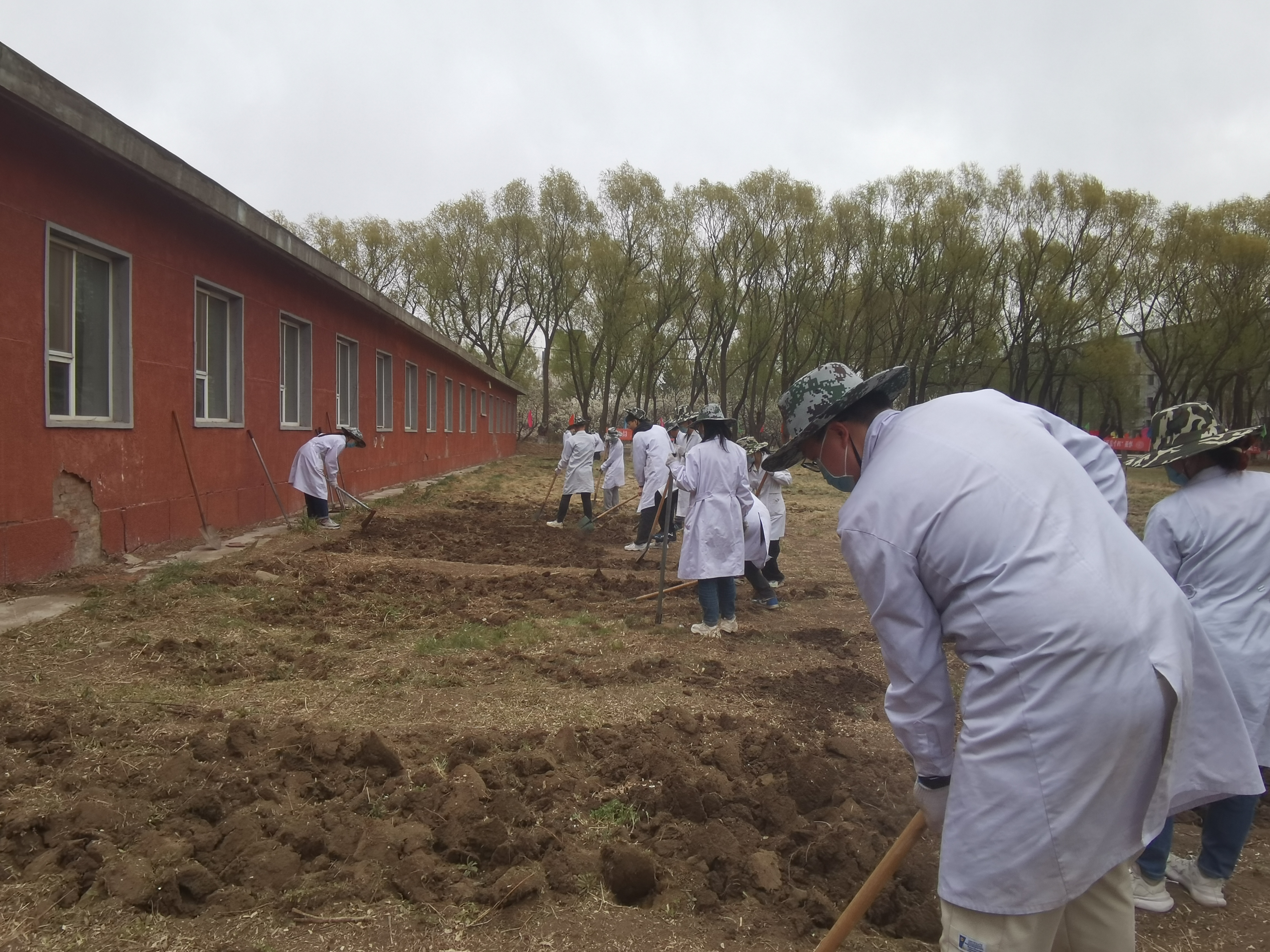 在活动开始的前一天,两名专业课教师为大家讲述了劳动的动作要领及相关注意事项,为同学们分配任务,引导员工正确使用劳动用具。在活动过程中,两位老师亲自拿起锄头,为大家示范起垅的动作要领,讲述每个步骤在牧草生长过程中所起到的作用。活动第一天上午9时,全体人员准时到齐,在专业课老师的带领下前往领取劳动用具,同学们分成六组,每组4人,当天完成了清除杂草的工作。同学们分工明确、默契十足、全心全意投入其中,先后完成了翻耕整地、起垄播种等工作。