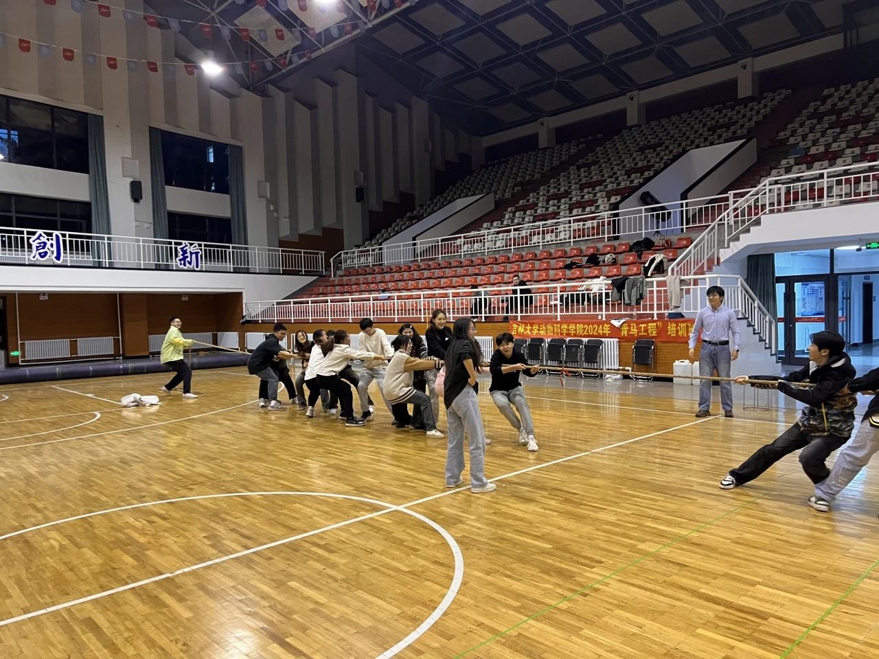 每两组选派等量成员进行拔河,其余人员作为观众加油助威。