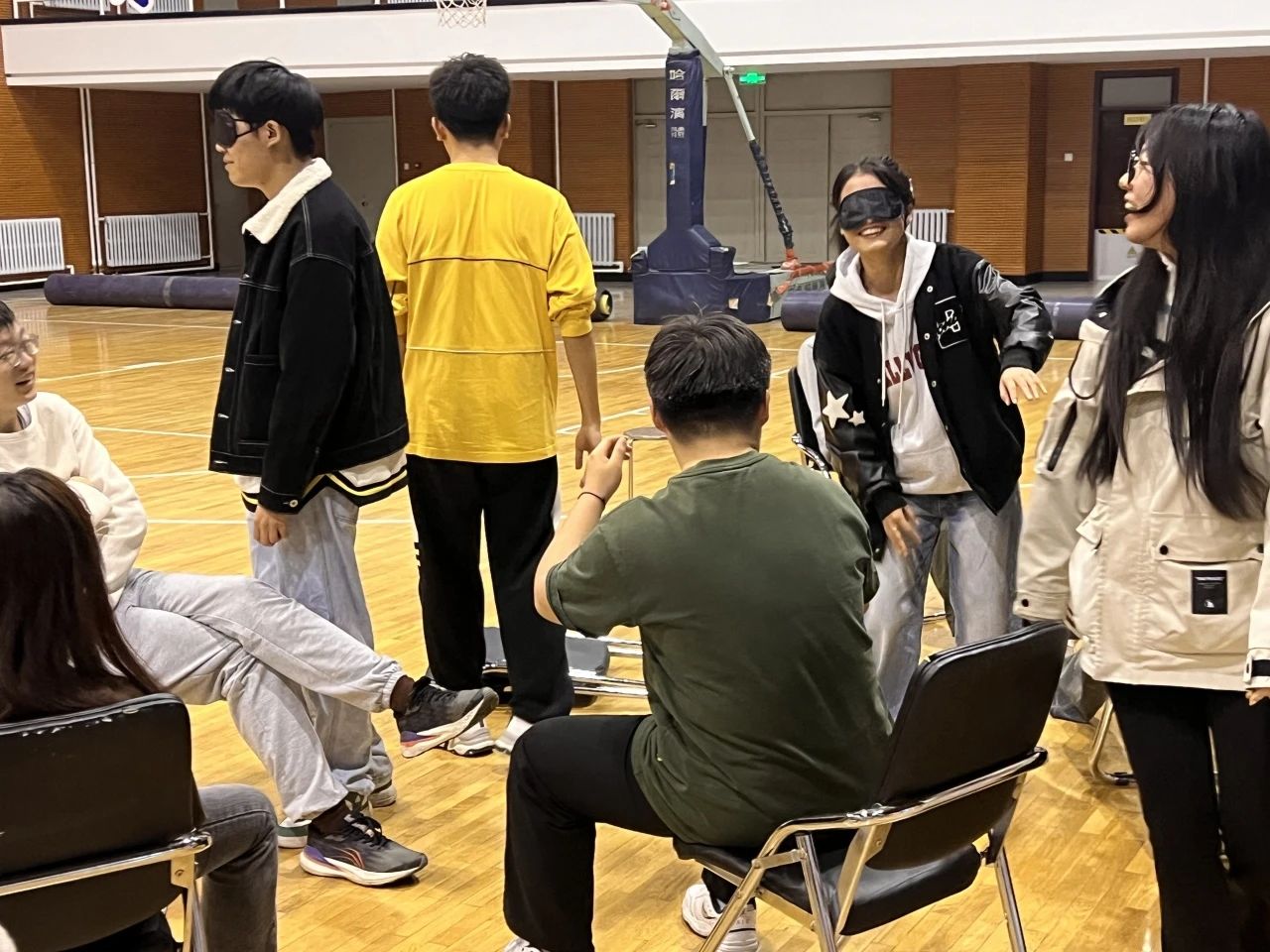 每组选三人蒙眼为“盲人”,其余为指引者,通过团队协作,“盲人”在指引下穿越障碍,用时最短组胜出。