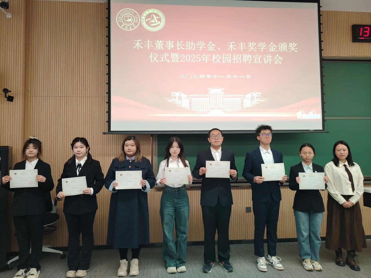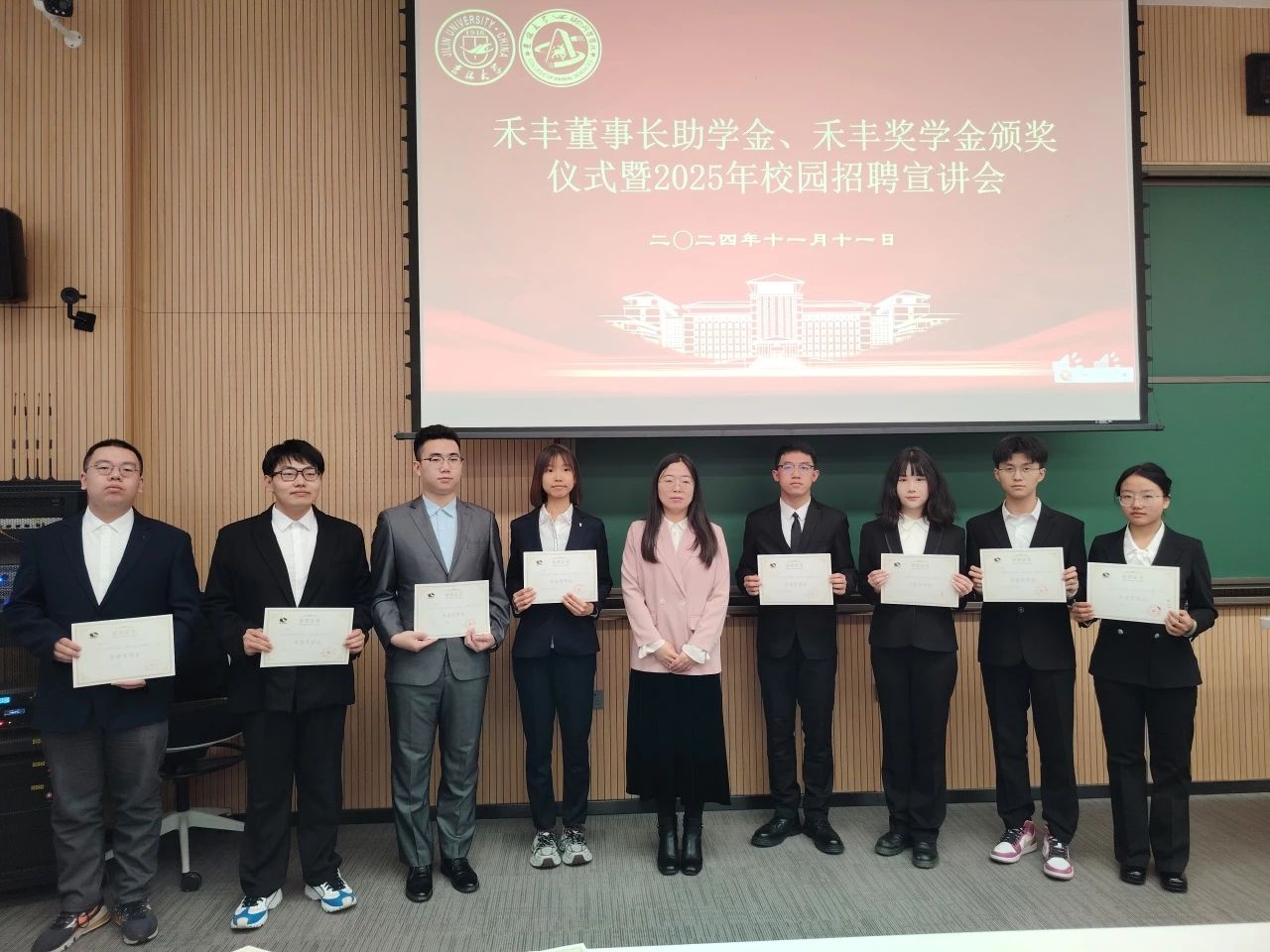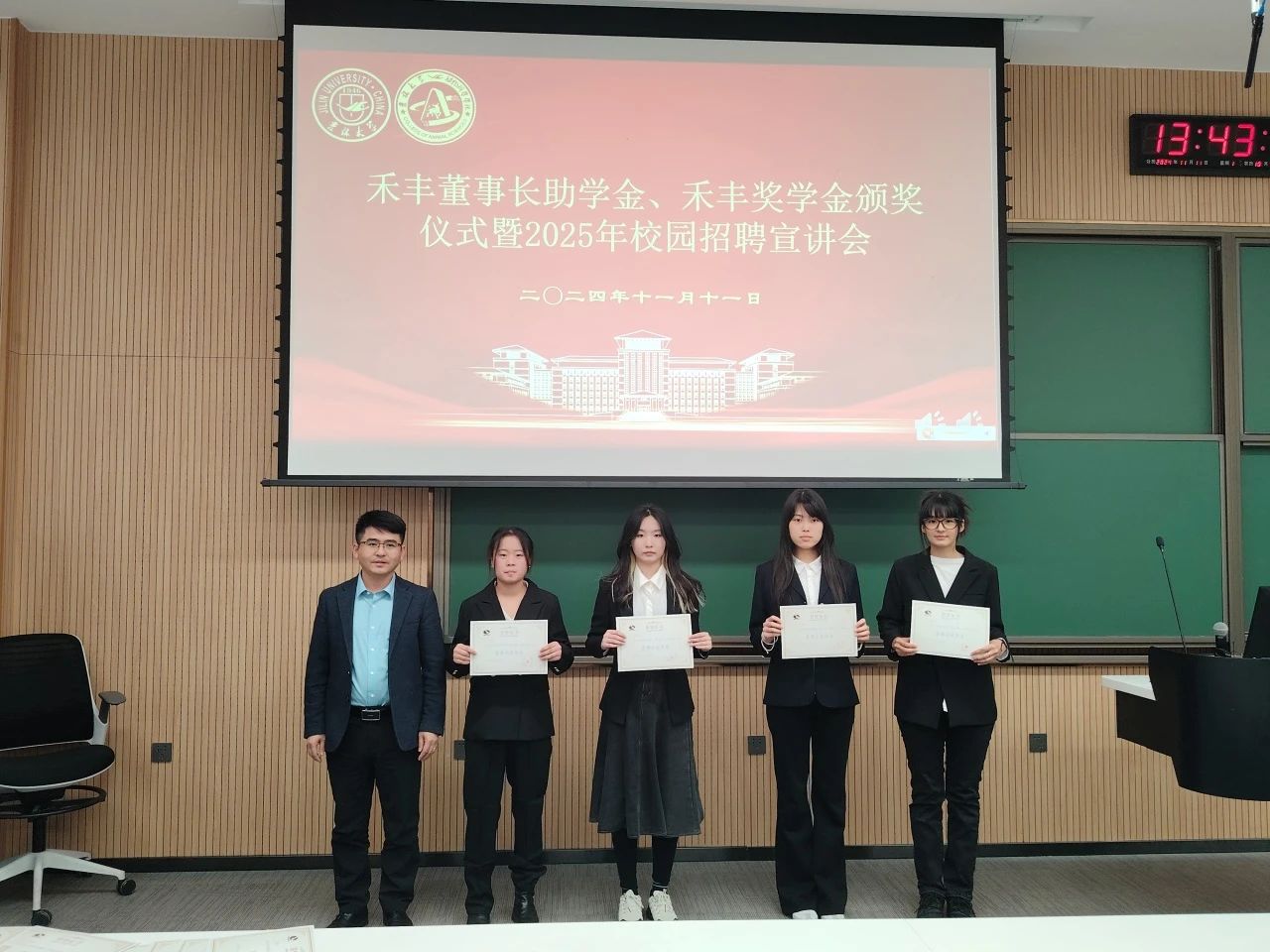 随后,谭瑶宣读2024年度“禾丰董事长助学金”和“禾苗奖学金”获奖名单。刁秀镯、杜娟、刘旭分别为获奖同学颁发证书,合影留念。
