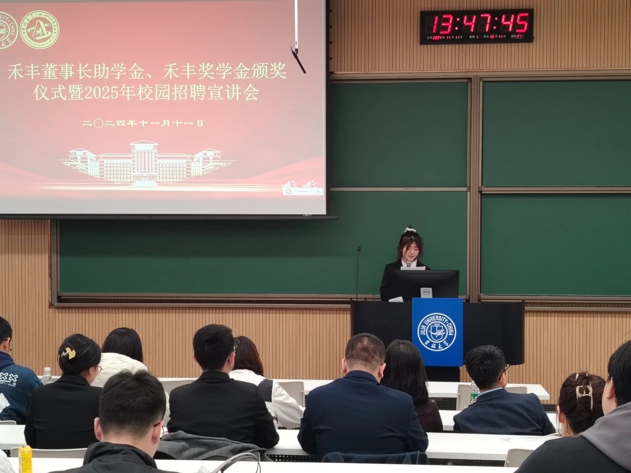 在宣讲环节,杜娟围绕禾丰集团2025届校园招聘计划进行了讲解,她从发展历程、企业文化、人才培养、薪资待遇等方面展开,表达了禾丰集团对吉大毕业生的欢迎和期待,诚邀在场同学加入禾丰大家庭。