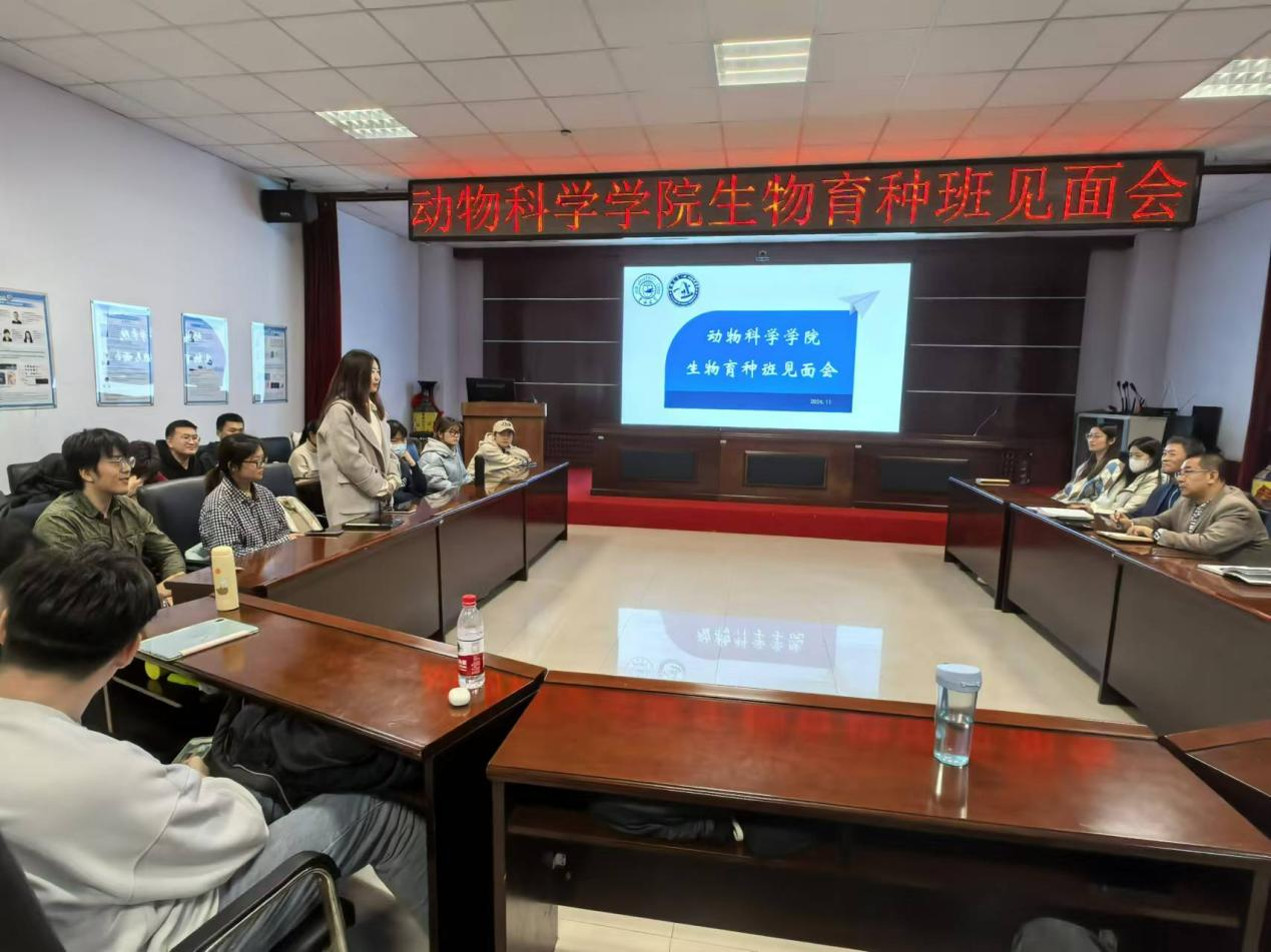 11月11日下午四点威廉体育于威廉体育一楼会议室举行生物育种班见面会。参会人员有党委书记高福和、经理孙博兴、副经理李纯锦、副书记兼副经理肖建荣、教学办公室秘书张峭朋、辅导员贾子一,2023级以及2024级动生物育种班全体同学。