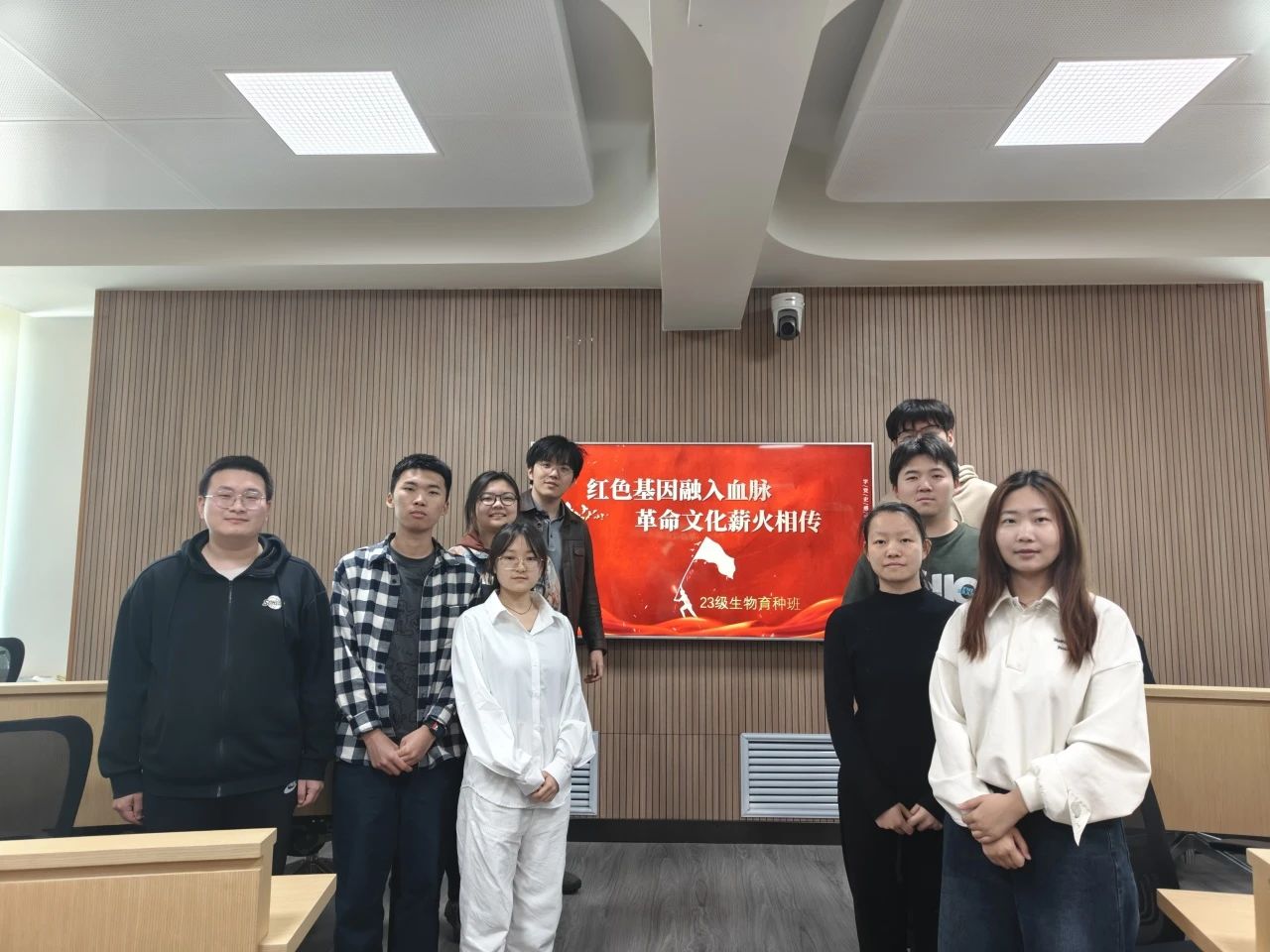 4月14日,2023级生物育种班的同学们在科学讲堂202教室开展以“青春续写红色密码,指尖传承百年薪火”为主题,结合生物育种专业特色的团日班会。本次会议以《觉醒年代》纪录片片段为引,带领同学们重温那段峥嵘岁月。开展“遵义会议转折意义”“抗美援朝精神内涵”等专题小组讨论。以“守好红色根脉,争做时代先锋”思想汇报为升华点,为同学们介绍袁隆平、李振声等农业科学家事迹,阐释红色精神在生物育种领域的传承路径。最后,团支书呼吁大家践行“三个一”计划:精读一本红色经典、参与一次农业实践、设计一项育种课题。活动尾声,全班同学在“红色基因·科技报国”主题展板前庄严合影,许下青春誓言。