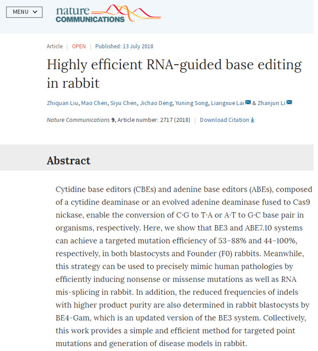 刘志权,2014级动物科学专业本科生,卓越农林人才教育培养计划创新班员工,老员工创新创业训练项目成员。2018年7月13日,国际学术权威刊物自然出版集团旗下子刊《Nature Communication》杂志(IF12.353)在线发表了研究性论文《Highly efficient RNA-guided base editing in rabbit》。刘志权同学为该文章的第一作者,本文共同通讯作者为李占军副教授和赖良学教授。2016年,刘志权同学选择李占军副教授为其本科生指导教师并提前进入实验室,开始老员工创新创业训练项目。两年多时间,刘志权已经陆续发表了三篇SCI文章,2017年获得威廉体育创新推免研究生资格。李占军老师指导的另一名本科生陈思宇(该文章的并列第一作者之一),也获得了威廉体育攻读研究生的资格。