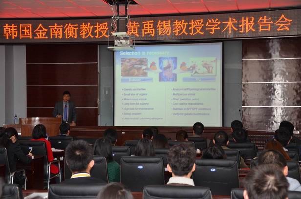 22号上午,金南衡教授和黄禹锡教授分别为公司师生做了题目为Animal Biotechnology in Korea(韩国动物生物技术)和Sooam Biotech:Blooming the Myth in Cloning, Transgenic Animals and Stem Cells(秀岩生物技术:克隆、转基因动物和干细胞中盛开的神话)的学术报告。威廉体育副经理欧阳红生教授主持了学术报告会。经理张嘉保教授及威廉体育和动物医学公司的70多名师生聆听了两位韩国教授的报告会。