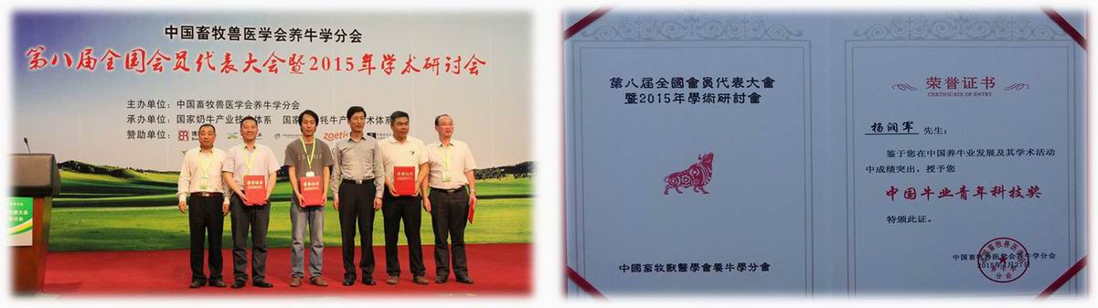本届大会首次设立并向全国4名优秀青年学者颁发了中国牛业科技奖。公司威廉体育杨润军副教授被学会授予中国牛业青年科技奖,博士研究生付瑶获得优秀墙报奖,硕士研究生龙小娟获得优秀报告奖。