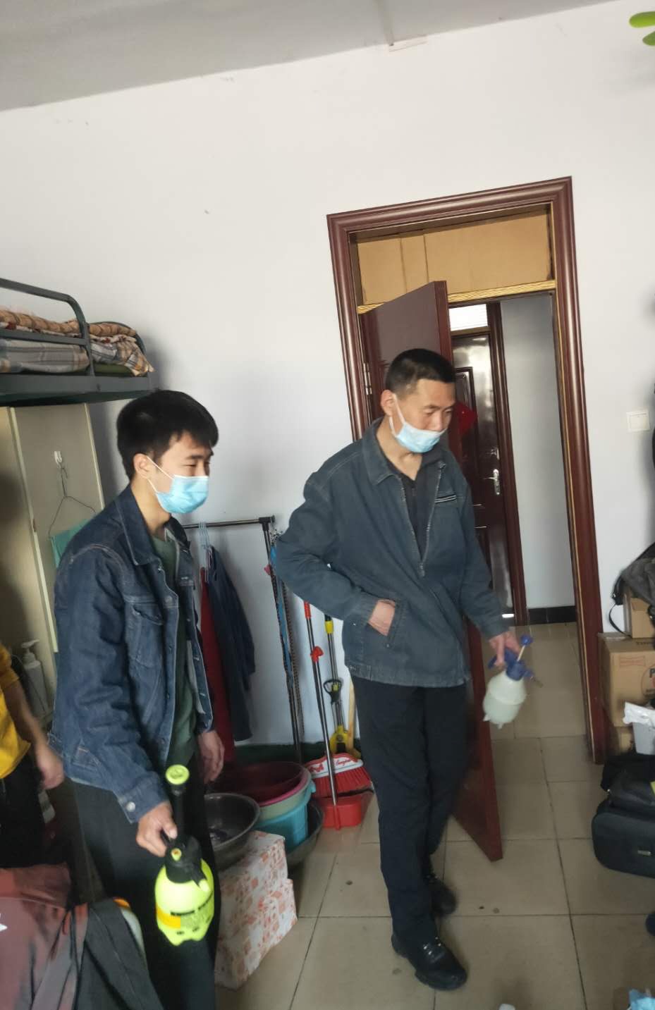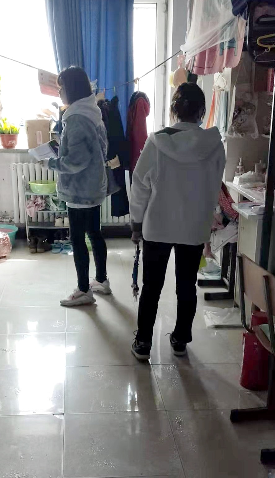 检查组一方面对各寝室地面进行了全面消毒,防止药物喷洒到其他地方造成腐蚀的同时,不忽视积灰角落,做到不留死角,同时提醒研究生注意寝室消毒后的通风换气;另一方面对各研究生寝室对用电情况进行仔细排查,坚决禁止使用违规电器,防止火灾发生。
