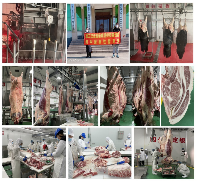 枣北牛育肥、屠宰和肉质性能测定:2022年12月15-17日,团队赴湖北省枣阳市枣北县杨当镇振泰天龙牧业有限公司进行枣北牛屠宰测定。2022年12月15日测定了枣北牛育肥去势公牛和母牛的初测体重、终测体重、日增重3个育肥性能指标。2022年12月16日上午完成了10头育肥枣北牛去势公牛的屠宰测定工作,分别测定了10头育肥枣北牛的宰前活重、胴体重、净肉重、骨重、屠宰率、净肉率、肉骨比、肋骨对数、眼肌面积共9个屠宰性能指标。2022年12月17日对10头枣北牛胴体进行分割,完成了屠宰夷陵牛的肌肉大理石花纹、肉色、脂肪颜色、嫩度、pH和肌肉系水力等6个肉质性能指标测定工作。