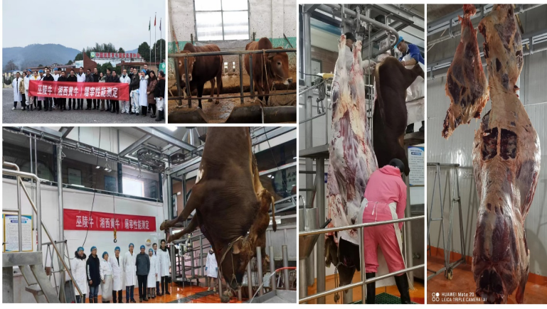 夷陵牛育肥、屠宰和肉质性能测定:2022年12月16-19日,团队赴湖北省宜昌市枝江市仙女镇湖北丰联佳沃农业开发公司进行夷陵牛屠宰测定。2022年12月17日测定了夷陵牛育肥去势公牛和母牛的初测体重、终测体重、日增重3个育肥性能指标。按照新审定遗传资源填平补齐原则,2022年12月18日上午完成了8头育肥夷陵牛(去势公牛和母牛各4头)的屠宰测定工作,分别测定分析了8头育肥夷陵牛的宰前活重、胴体重、净肉重、骨重、屠宰率、净肉率、肉骨比、肋骨对数、眼肌面积共9个屠宰性能指标。2022年12月19日对8头夷陵牛胴体进行分割,完成了屠宰夷陵牛的肌肉大理石花纹、肉色、脂肪颜色、嫩度、pH和肌肉系水力等6个肉质性能指标测定工作。