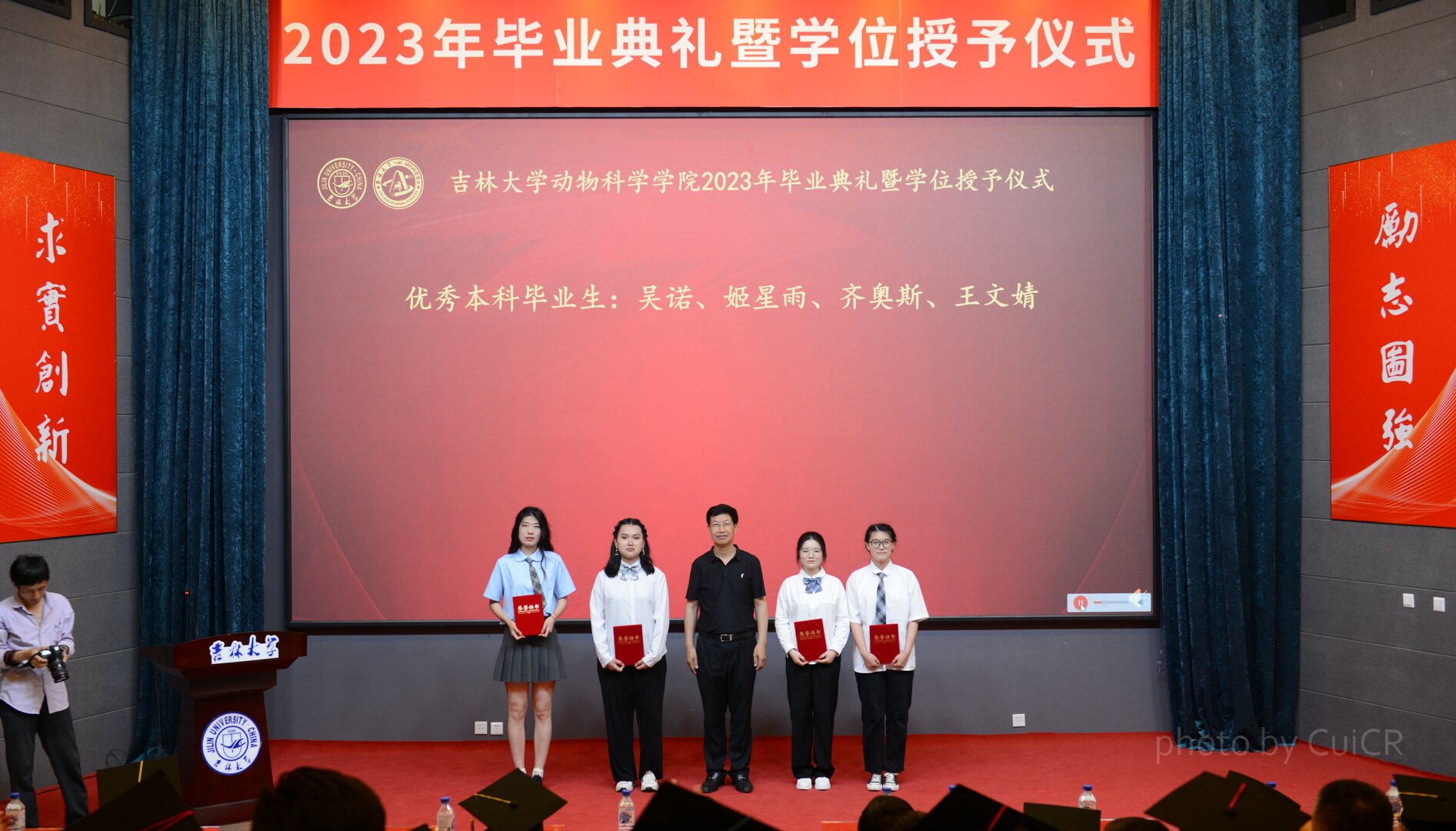 本科生毕业生代表、2019级动物科学专业王子娇同学以及毕业研究生代表、2018级畜牧学学科郑毅同学发表毕业感言。他们回顾了在吉大的求学之路,表达了对母校和老师的感恩之情与惜别之意,并表示在毕业后,将传承“求实创新、励志图强”的校训精神和“厚德笃行,创新致远”的院训精神,承担起新时代青年责任,将在校期间所学应用到实践中,为国家建设注入青春力量。