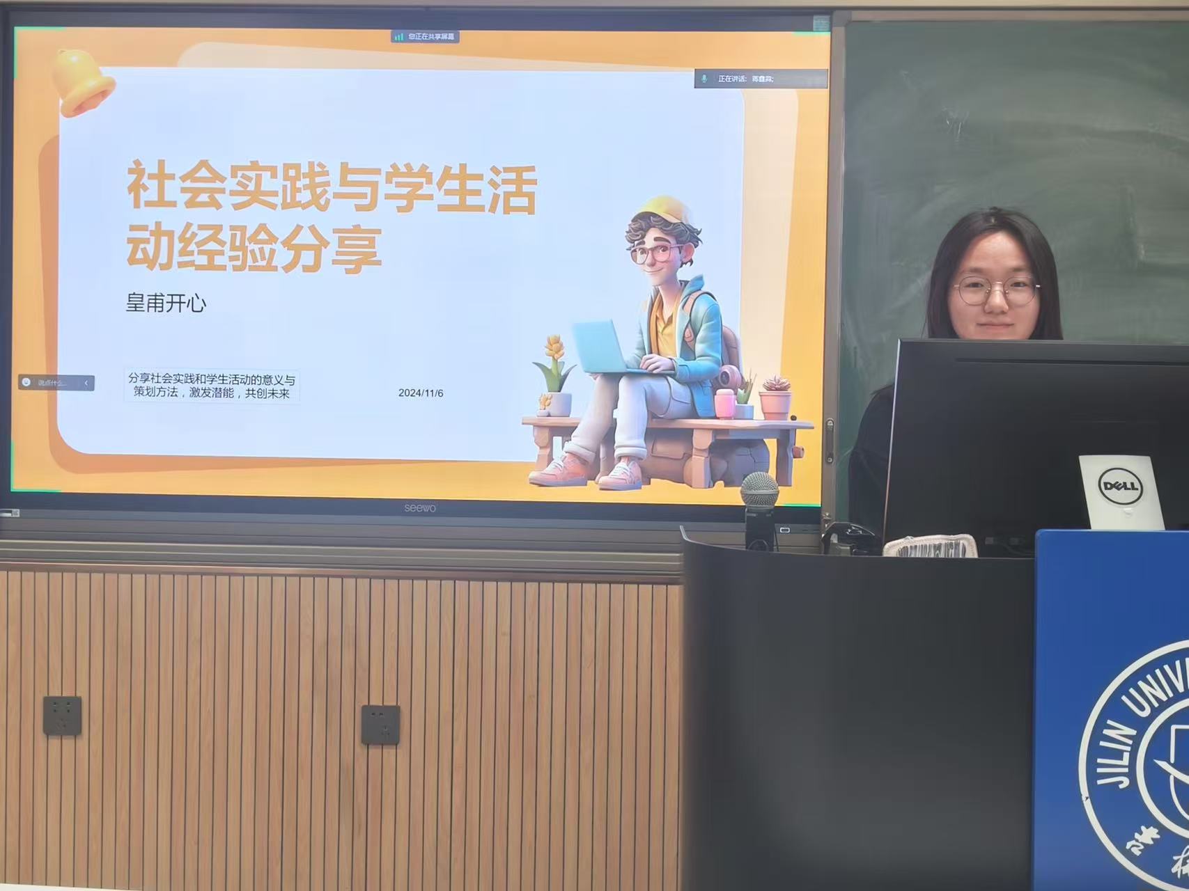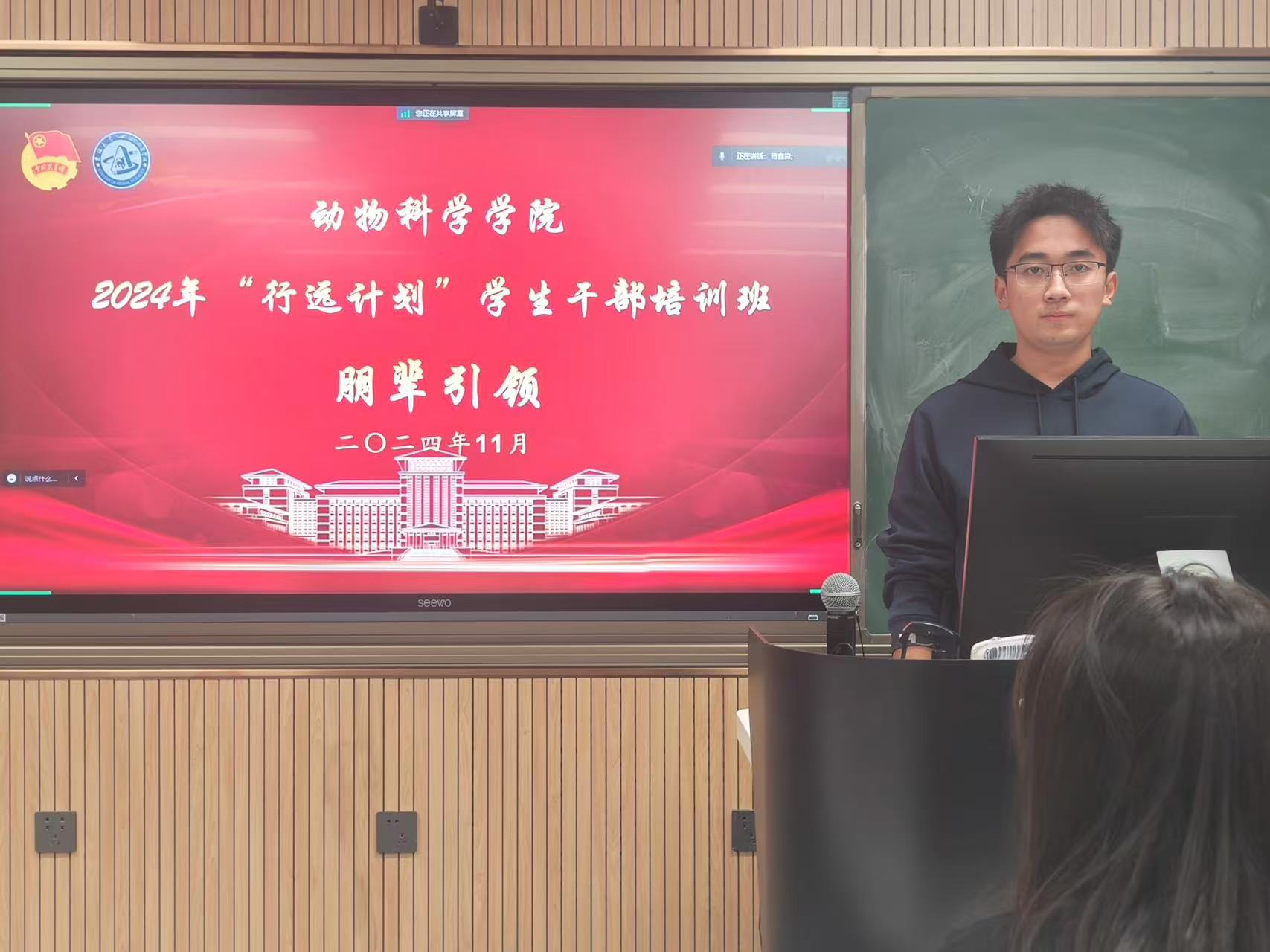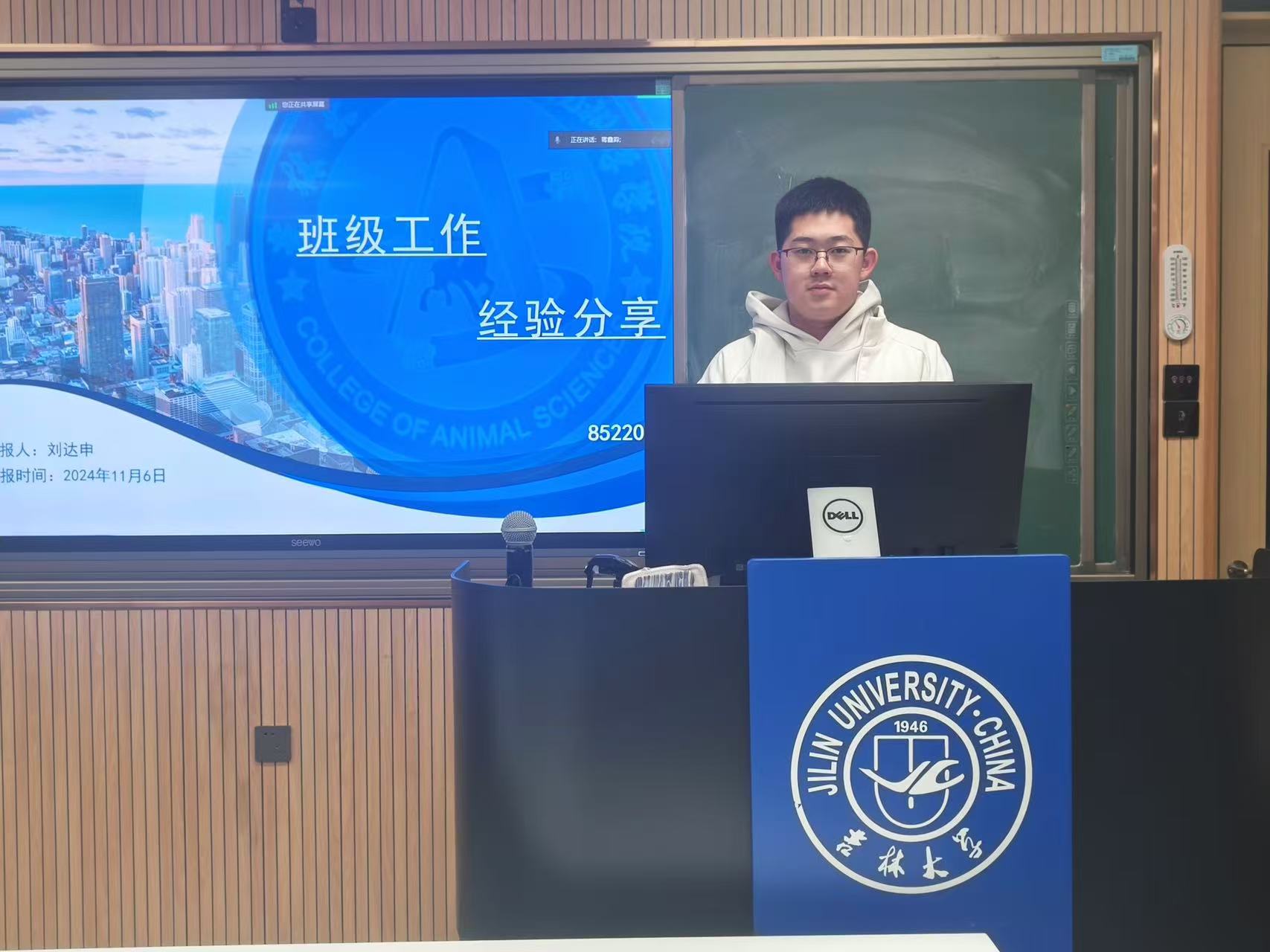 动物科学专业2021级二班班长刘达申基于班级建设方面分享了个人经验。他通过一系列丰富多彩的团建活动照片,生动展现了班级的和谐氛围与卓越的思想学风建设成果,全面概述了班级概况。刘达申建议同学们着眼于细微之处,时刻担当起班长的职责。