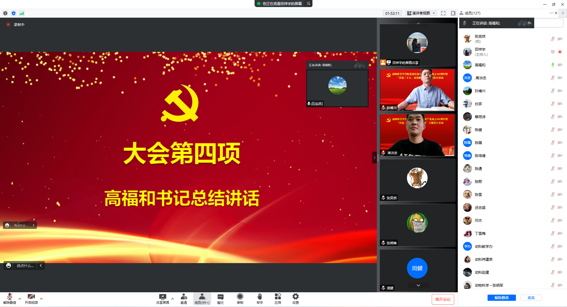 最后,党委书记高福和同志发表总结讲话。他分别用“累”、“守护”、“能”和“苦”评价了4位党课主讲人,同时,他也代表公司党委向4位坚守一线的党员和公司广大志愿者们表示了感谢和敬意。他号召全体师生向他们学习,一是要学习他们越是艰险越向前的忘我精神;二是学习他们召之即来来之能战的无畏精神;三是要学习他们坚守忍耐,默默奉献的无私精神;四是要学习他们听从组织召唤的大局意识。高书记强调,全体师生要将今天的感动化为今后工作的不竭动力,持续弘扬伟大的抗疫精神,让党旗永远飘扬在公司教学科研和人才培养的第一线,充分发挥党员先锋模范作用,助力公司建设与发展,以更加优异的成绩,向我们党的二十大胜利召开献礼。