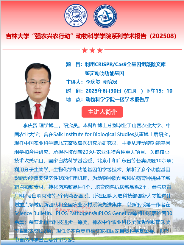李庆贺 理学博士,研究员。本科和博士分别毕业于山西农业大学、中国农业大学;曾在Salk Institute for Biological Studies从事博士后研究。现任中国农业科公司北京畜牧兽医研究所研究员,主要从事动物功能基因组学和育种研究;承担科技创新2030-农业生物育种重大项目、关键核心技术攻关项目、国家自然科学基金委、北京市和广东省等各类课题10余项;利用分子生物学、生物化学和功能基因组学等技术,解析了多个功能基因影响动物重要经济性状的作用机理,为动物种质创新和抗病育种提供了新靶点和新素材。转化肉鸡新品种1个,培育肉鸡抗病新品系2个,参与培育广明2号白羽肉鸡等2个肉鸡配套系。所在团队入选科技部创新人才推进计划重点领域创新团队和全国农业农村系统先进集体。以通讯或第一作者在Science BulletinPLOS PathogensPLOS Genetics等期刊发表论著30余篇;荣获北京市科技进步一等奖、神农中华农业科技奖优秀创新团队奖等省部级奖励2项;担任多本杂志审稿专家和国家自然科学基金委、北京市自然科学基金委评审专家。