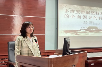 周慧红博士以《多维度把握坚持和加强党的全面领导的科学内涵》为主题,从“目标定位”、“基本要求”、“价值诉求”、“制度保障”四个维度为支部研究生党员深刻解读了习近平总书记关于坚持和加强党的全面领导的重要论述中的先进精神与时代内核。同时,她还结合习近平总书记的系列经典论述,以新民主主义革命时期、社会主义革命和建设时期、改革开放新时期等不同历史时期为切入点,着重强调了“毫不动摇地坚持和加强党的全面领导”的先进性与重要性。